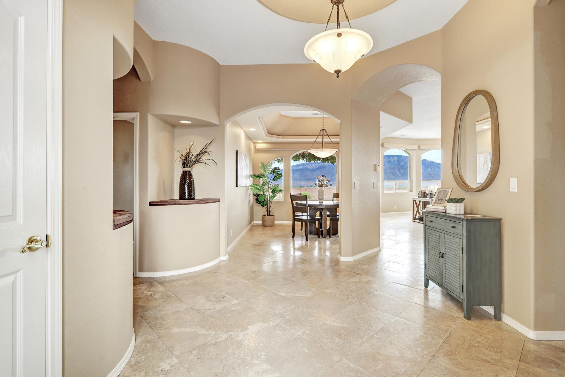 Unobstructed VIEWS inside and out! Custom Single Level Sanctuary: 4 BR 3 Bath home on private 1.24 acres. Experience panoramic views of the Sandias, plus magic during Balloon Fiesta! Spacious open floor plan accommodates handicap accessibility. Great room features wall to wall windows & french doors open to covered patio for entertaining or relaxing. Owned SOLAR. Cook's kitchen: 5 burner induction cooktop, rich granite counters & breakfast bar. Primary BR suite with bay window, ceiling detail & luxurious bath with jetted tub, dual vanities, separate toilet with bidet.All BR's have hardwood floors. Spacious 3 Car Garage with electric charger.Drought tolerant landscaping. Experience the Corrales lifestyle with trails, quaint eateries, farmer's market, easy access to Santa Fe and ABQ via I-25