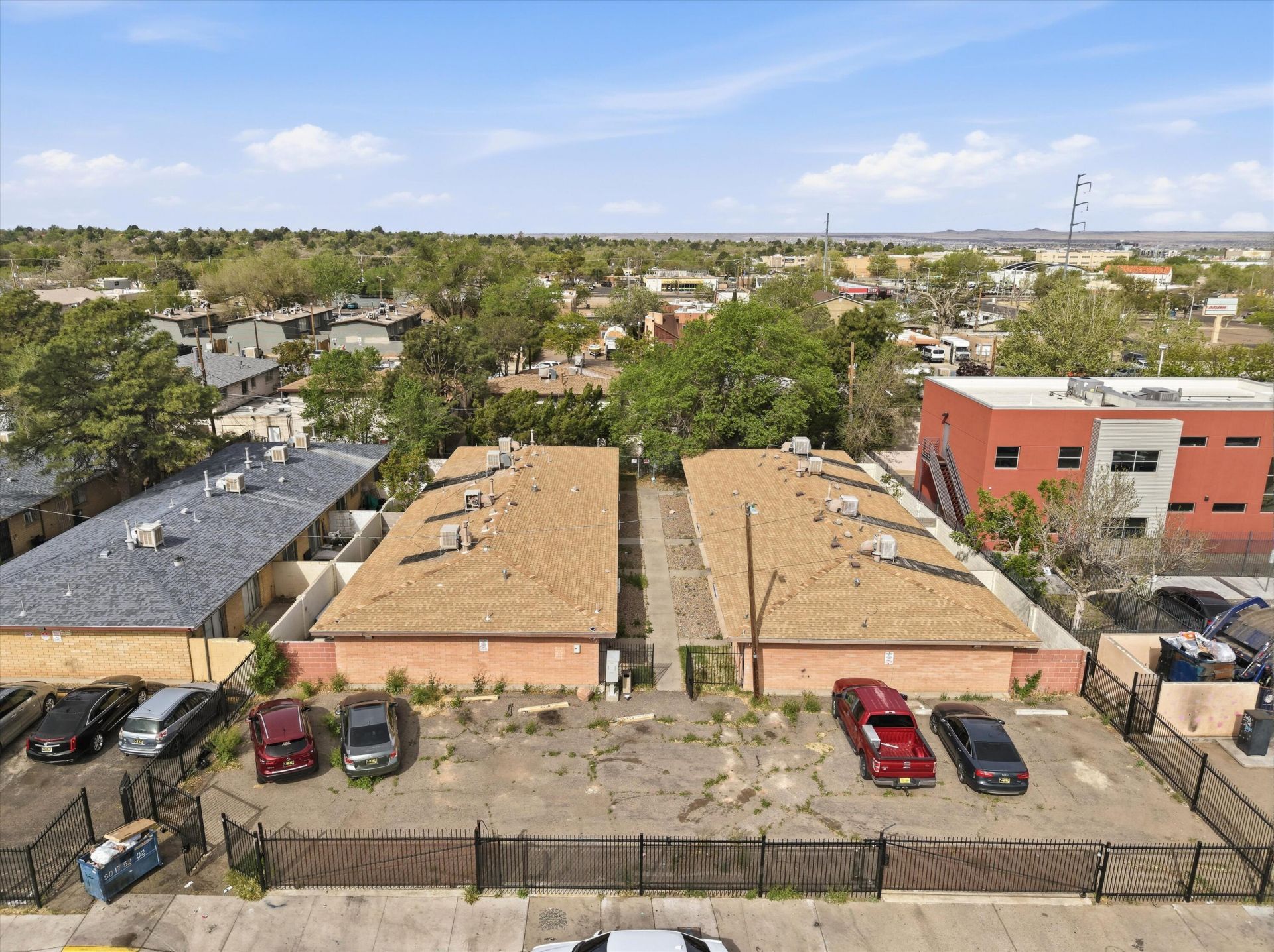 Durable brick 4-unit investment property designed for low maintenance and long-term ownership, conveniently located near major shopping centers, Kirtland AFB, and UNM area. Features a pitched shingle roof that adds durability and helps reduce exterior maintenance. Each unit offers a private backyard space, refrigerators and free-standing ranges, washer/dryer hookups, central forced-air heating, evaporative cooling, and full insulation for year-round efficiency. The property includes a security metal-gate for both vehicle and pedestrian access. A surveillance security system is currently in place and may be purchased separately from the seller. Property is being sold as-is and may be purchased individually or together with 517 Paloma as an expanded investment. Possible Section 8 qualifier