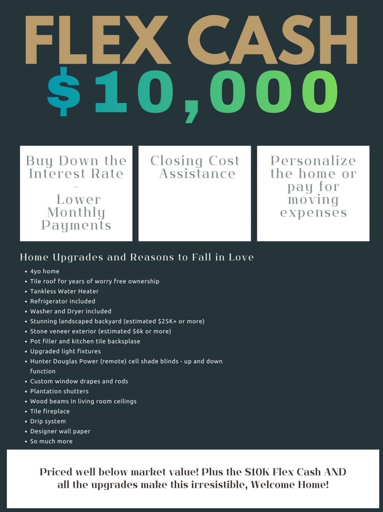 Nestled in a sought-after neighborhood, the stacked stone exterior, tile roof, 3-car garage, and 8' 9-light door tell you - this is different. Inside, a chef's kitchen steals your heart: soaring high-end cabinetry, pot filler, shimmering Moonstone Granite, and an island made for gathering the ones you love most.Primary suite is pure indulgence, a closet with room for everything. Custom drapes, power blinds, designer wallpaper, and artistic lighting make every corner whisper elegance.Flex room grows with your family. Backyard is a private sanctuary, low maintenance, high luxury where evenings feel like an escape.Tankless water heater. Ref/AC. Worry-free from day 1. Now the part that makes this irresistible - priced well below market value AND $10K Flex Cash offered! Welcome home!